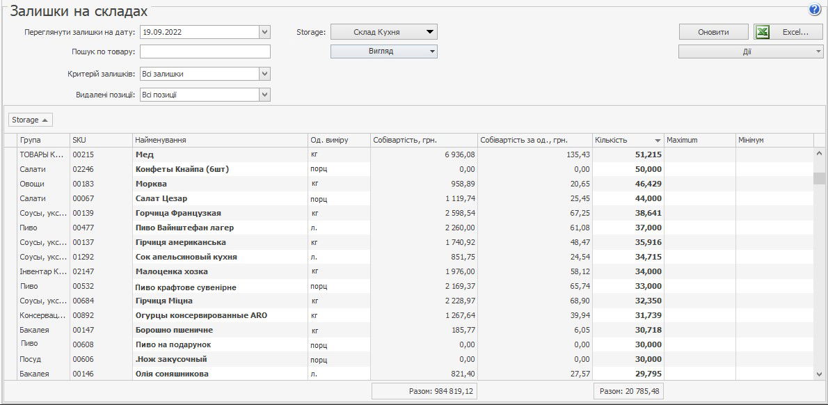 У звіті Залишки на складах відображається кількість товарів та готових страв на складі за певну дату. З його допомогою можна контролювати залишки та поповнювати запаси товарів, виявляти прострочені продукти, коригувати від'ємні залишки.