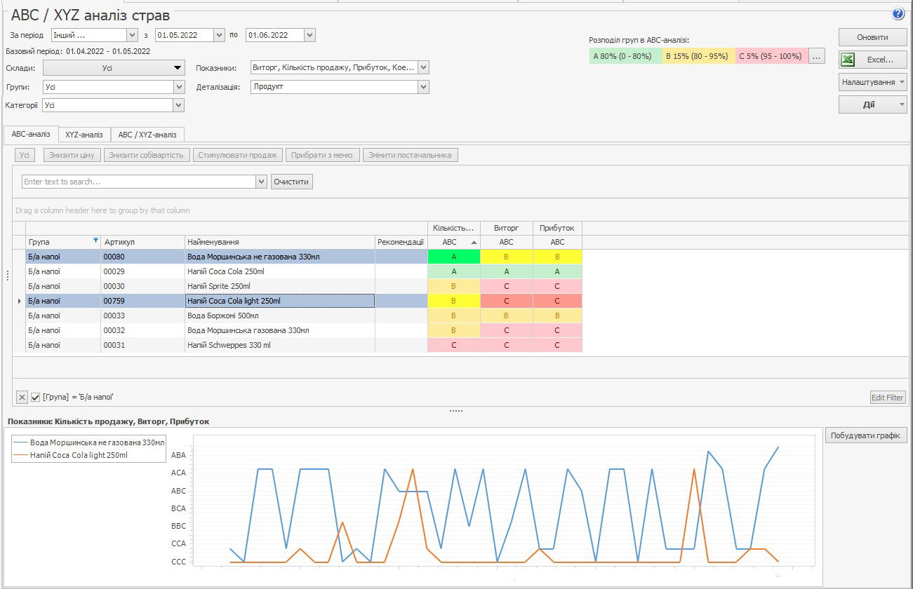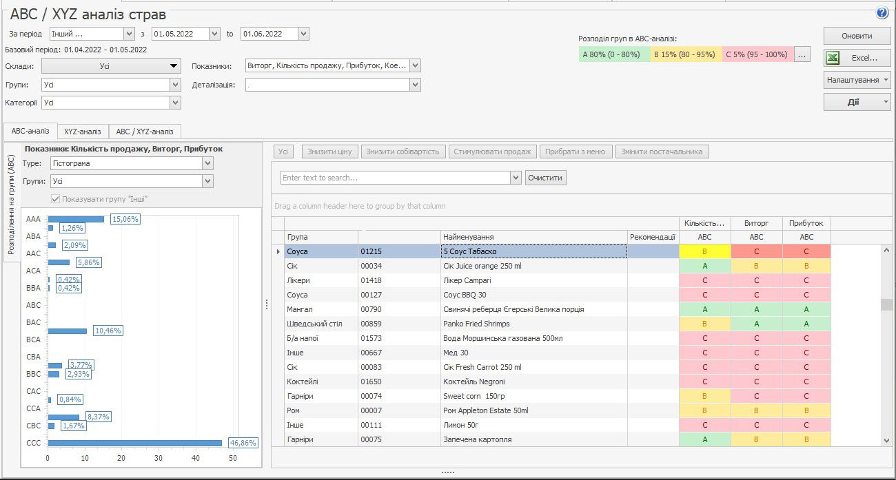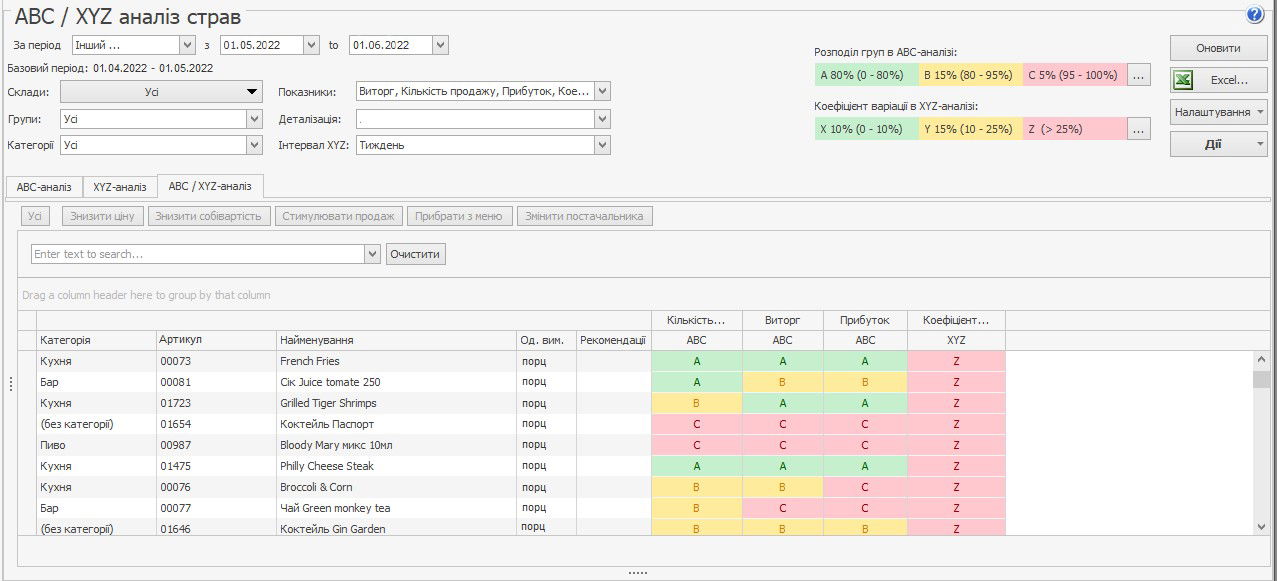 ABC-аналіз страв - це ранжування продаваних позицій меню за ступенем важливості на основі трьох груп. Найчастіше це кількість продажів, оборот і прибуток.