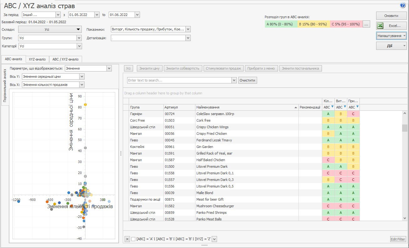 За допомогою порівняльного аналізу можна відстежувати зміни популярності та прибутковості страв. Для цього будується графік за двома обраними параметрами, на перетині яких відзначається страва.