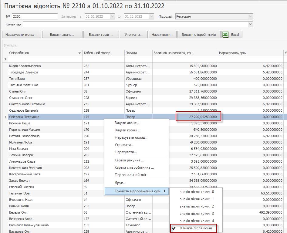Точність може бути встановлена в Платіжній відомості, Зведеному звіті із зарплаті, а також Персональному звіті вибором відповідного пункту контекстного меню. За замовчуванням суми показуються з точністю 2 знаки після коми.
