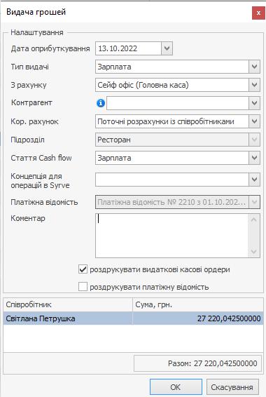 - Щоб роздрукувати видатковий касовий ордер або платіжну відомість за цією операцією, встановіть відповідні галочки.