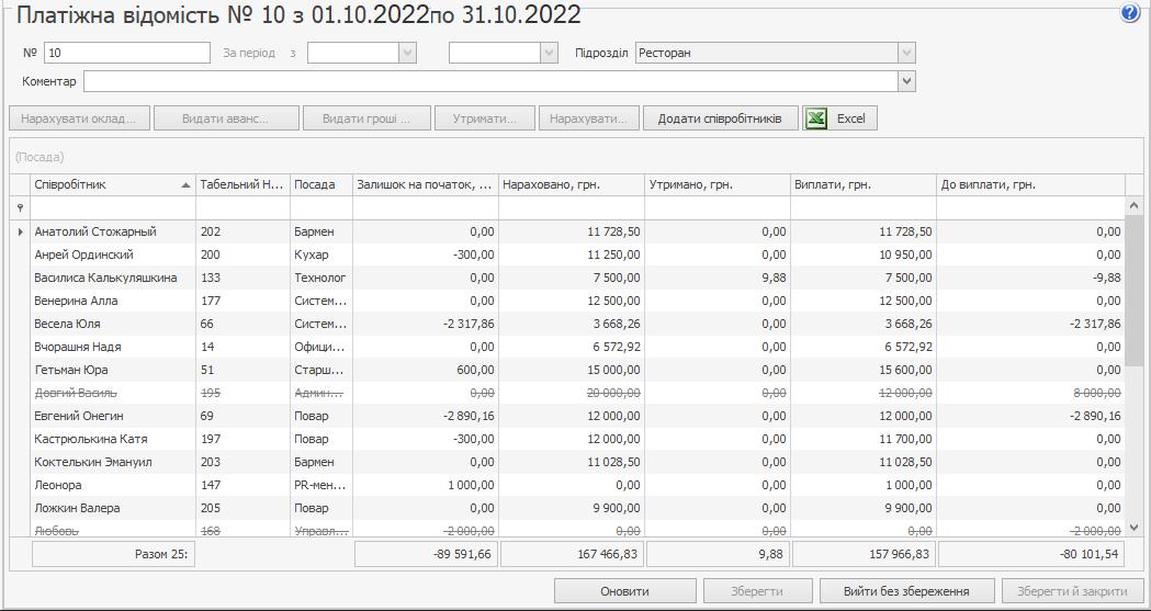 З платіжної відомості для групи співробітників можна нарахувати премії, оклади, аванси, зареєструвати утримання (штрафи), зарахувати гроші.