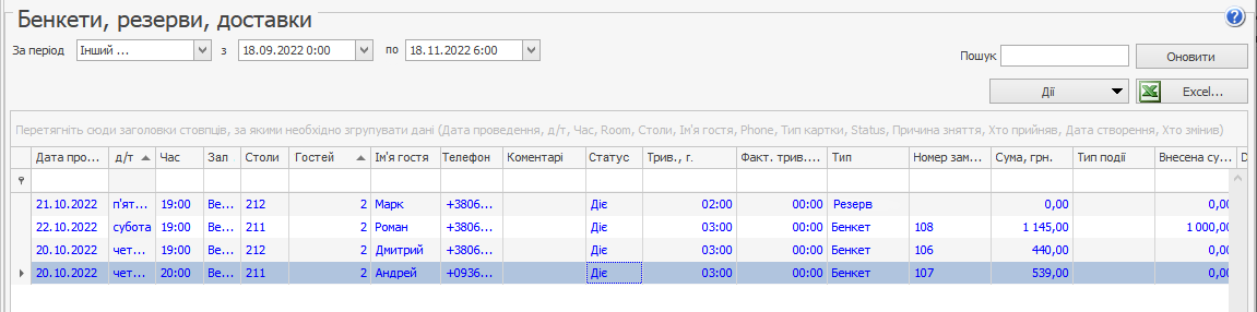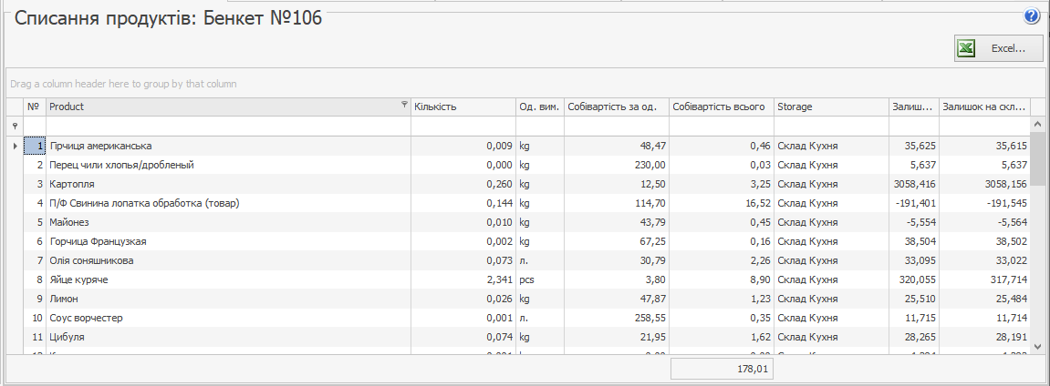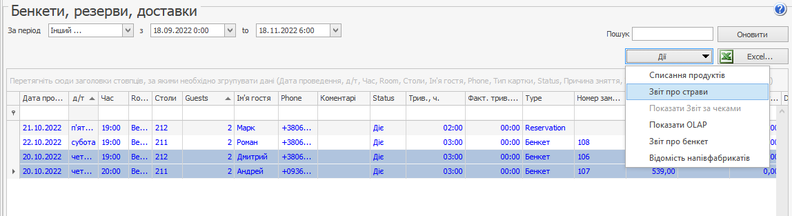 У процесі побудови звітів, якщо обираєте одразу кілька банкетів, страви та їхні інгредієнти підсумовуються.