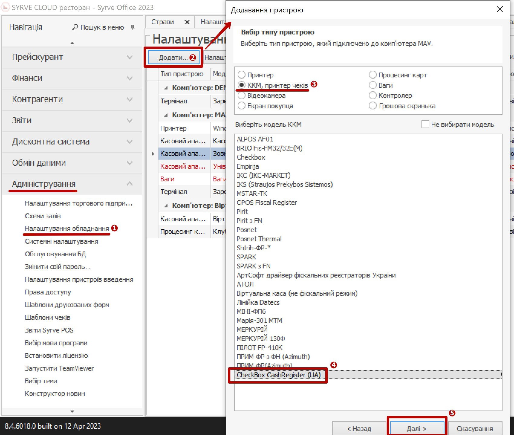 - У Syrve Office (Адміністрування - Налаштування обладнання) додати нову касу Checkbox (варіант установки каси з'явиться лише після того, як буде встановлено плагін):