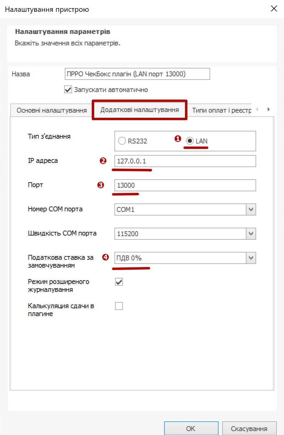 - У вкладці Додаткові налаштування, вибрати тип з'єднання LAN, ввести IP адресу (127.0.0.1) та порт підключення агента каси (за замовчуванням при одній касі на комп'ютері порт 13000). Також у вкладці додаткових налаштувань потрібно перевірити податкову ставку за замовчуванням, вона обов'язково має бути встановлена (за замовчуванням ставка “ПДВ 0%”).