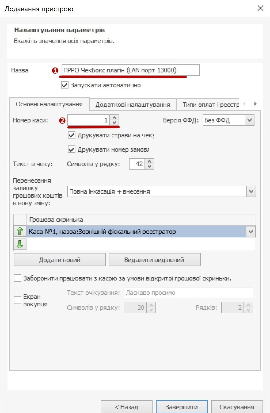 У вкладці Основні налаштування змінити лише номер каси та її назву.