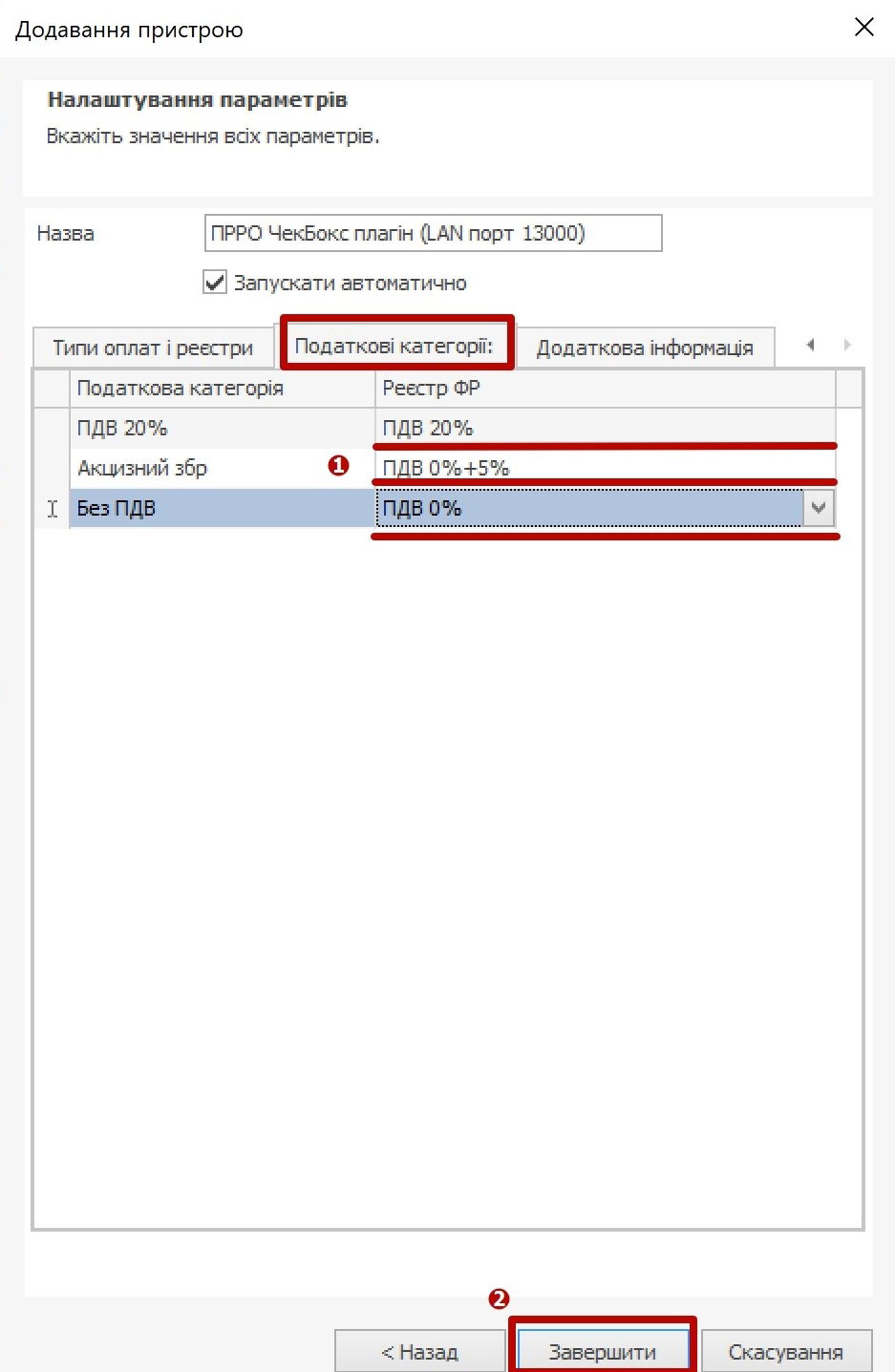 - Необхідно вказати відповідність між податковими категоріями, які налаштовані в Syrve Office та тими, що задані в плагіні у вкладці Податкові категорії. Тут можна обрати саме потрібний реєстр у касі Checkbox, та натиснути Завершити налаштування каси.