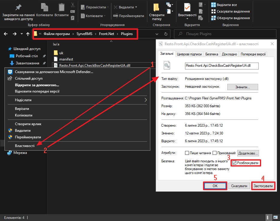 Примітка: перевірте, чи файл Resto.Front.Api.CheckBoxCashRegisterUA.dll не “заблоковано” ПЗ Windows. Та якщо це сталося - розблокуйте файл.