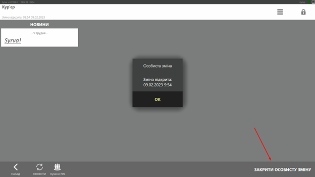 Для початку роботи оператор у відділенні відкриває особисту зміну кур’єра у терміналі Syrve POS, або кур’єр робить це самостійно у додатку.