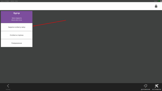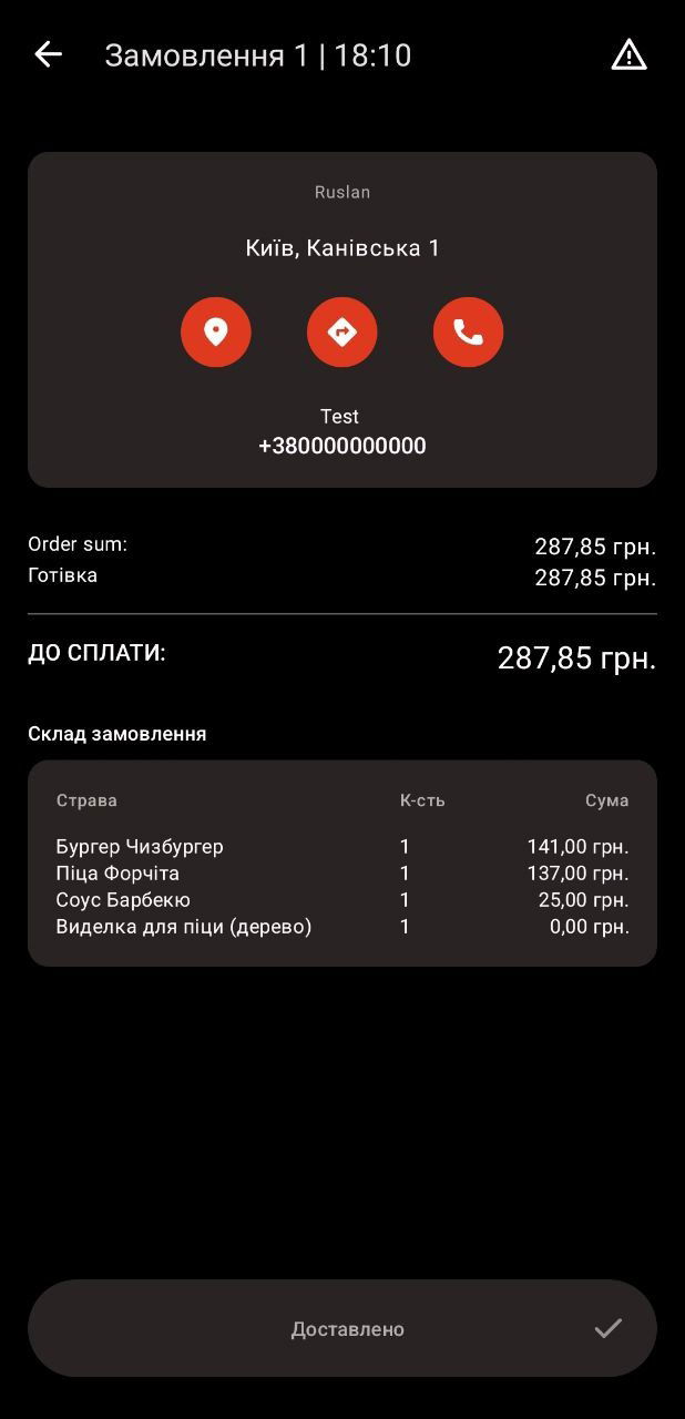 Після повернення до закладу кур'єр здає виторг, менеджер закриває замовлення, після цього замовлення зникає зі списку у додатку кур'єра.