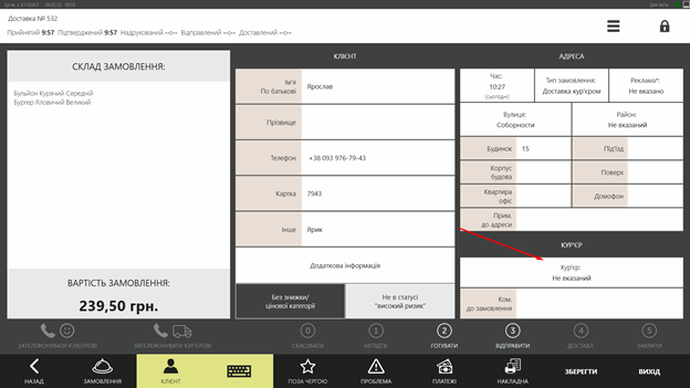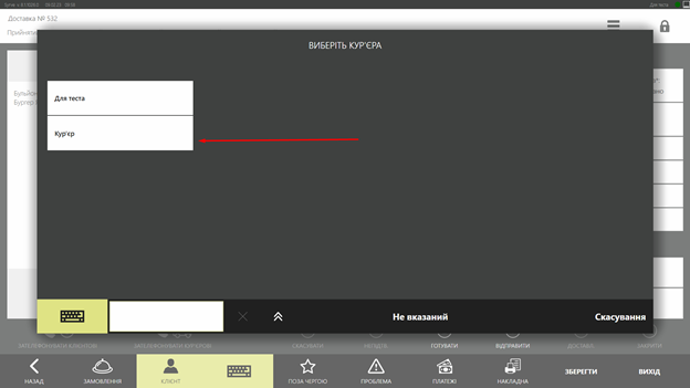Коли особиста зміна кур’єра в системі відкрита, оператор має можливість назначати кур’єра на доставку замовлення (або відразу або при відправленні доставки)