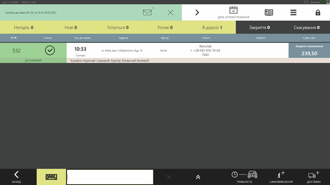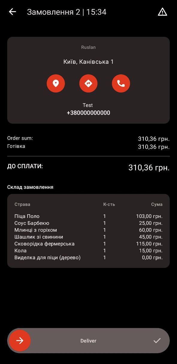 Коли кур’єр змінив статус доставки на «Доставлено» у оператора кол-центра чи оператора у закладі Syrve POS це відображається і далі оператору залишається тільки оплатити замовлення.