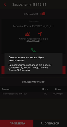 Мобільний кур'єр може зазначити, що замовлення доставлено ще при під'їзді до клієнта з відстані, наприклад 500 метрів. При спробі зробити це на великій відстані він отримує відповідне повідомлення. Аналогічне повідомлення кур'єр може отримати якщо відзначає замовлення не відразу після його вручення, а вже по дорозі назад, наприклад від'їхавши від клієнта далі ніж на 500 метрів.