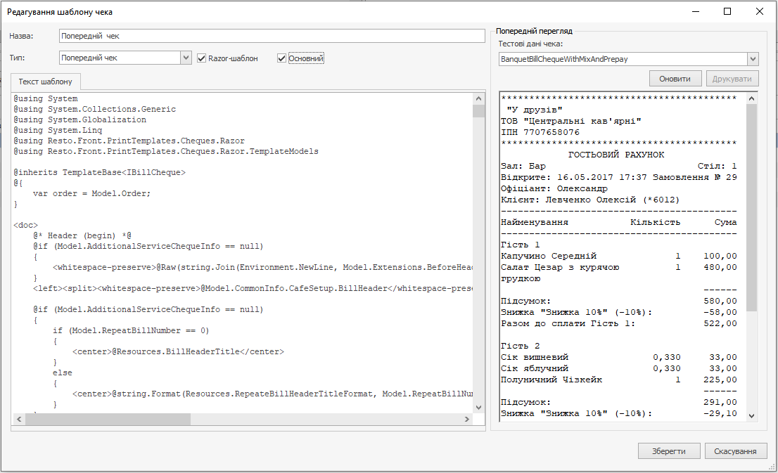 Чеки налаштовуються за допомогою Razor або XSLT шаблонів. Їх створення потребує певних навичок. Тому рекомендується звертатися до компанії – яка вас обслуговує.