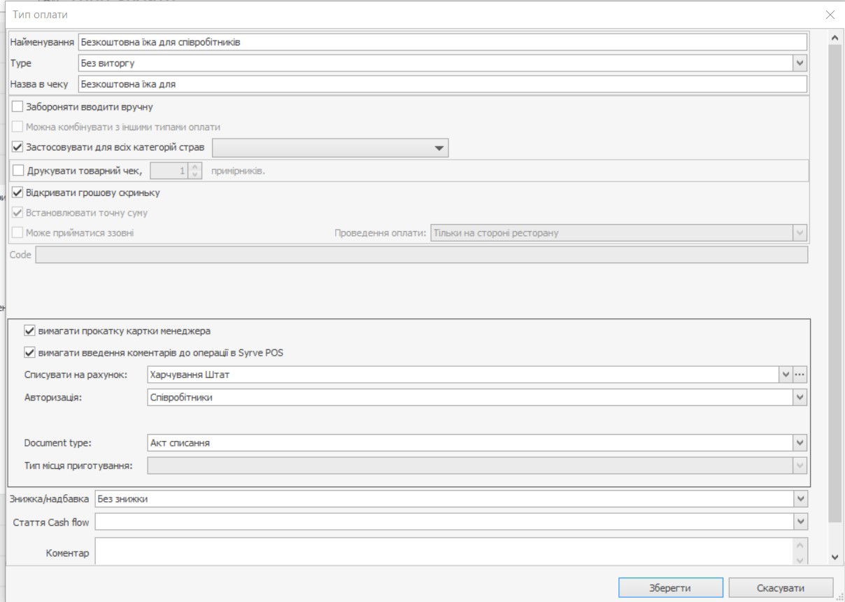 Для списання страв за рахунок закладу, наприклад, як безкоштовна їжа персоналу, необхідно налаштувати тип оплати Без виручки: