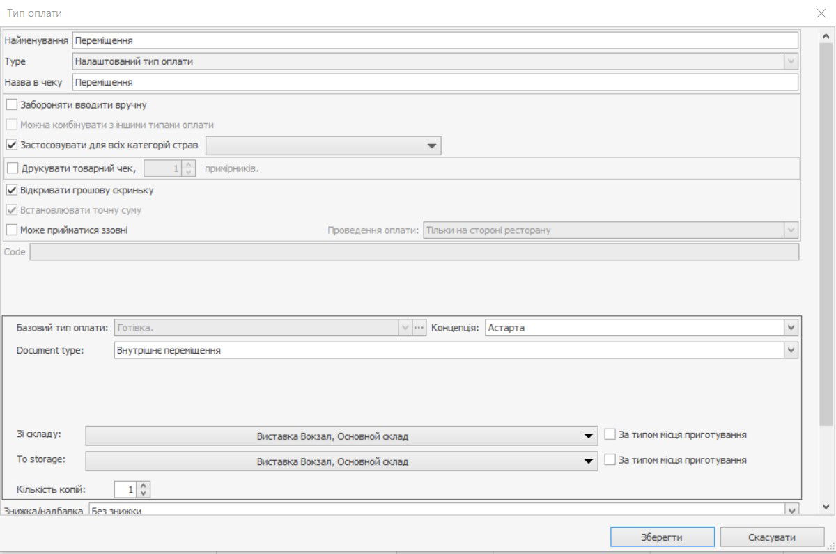 Для Налаштовуваного типу оплати необхідно також задати Базовий тип оплати. У поточній версії системи як «базова» може бути використана оплата будь-якого типу, крім «налаштовуваного типу оплати», наприклад, з типом платежу «Без виручки» або типом оплати «Готівкою».