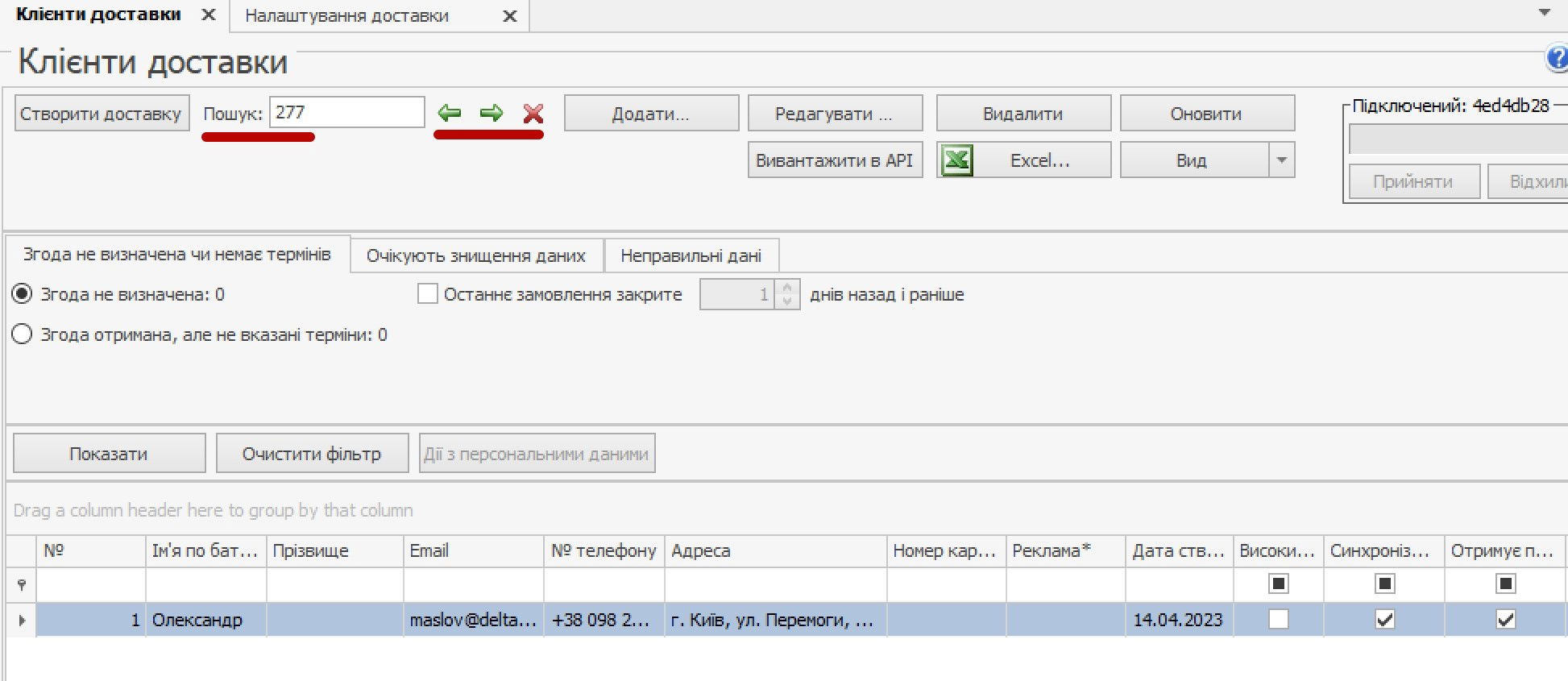 При оформленні доставки для пошуку клієнта можна використовувати будь-яку частину його імені, номера картки або телефону та інших даних. За замовчуванням, система шукає по всіх полях картки клієнта.