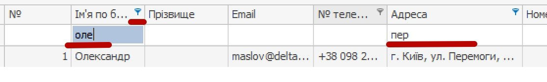 Дані за певним значенням можна відфільтрувати з допомогою конструктора фільтра. Наприклад, список клієнтів за номером телефону. Для цього наведіть курсор на область заголовка колонки для прикладу «№ телефону» праворуч і натисніть на значок фільтра (лійки), зі списку виберіть значення. Може бути також задано умову фільтрації даних. Також виконується відбір вулиць містом.