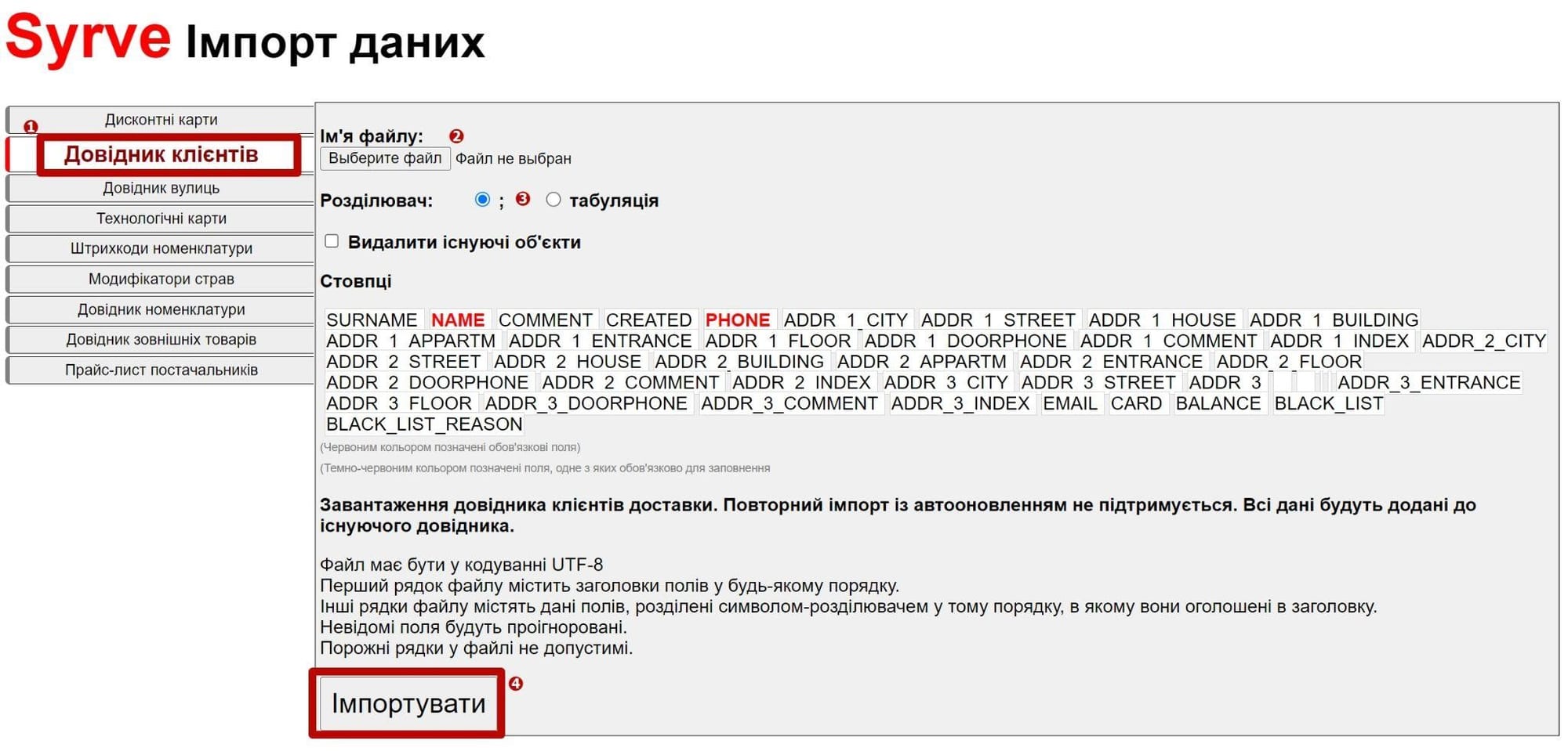 Дані клієнтів, а також назви вулиць можуть бути імпортовані в систему Syrve з файлів обміну формату *.csv (Microsoft Office Excel Comma Separated Values File), котрі мають певну структуру. Файл з даними для імпорту може бути підготовлений у MS Excel, а потім збережений у форматі *.csv.