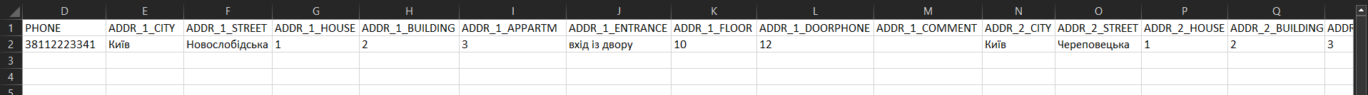 SURNAME; NAME; COMMENT; PHONE; ADDR_1_CITY; ADDR_1_STREET; ADDR_1_HOUSE; ADDR_1_BUILDING; ADDR_1_APPARTM; ADDR_1_ENTRANCE; ADDR_1_FLOOR; ADDR_1_DOORPHONE; ADDR_1_COMMENT; ADDR_2_CITY; ADDR_2_STREET; ADDR_2_HOUSE; ADDR_2_BUILDING; ADDR_2_APPARTM; ADDR_2_ENTRANCE; ADDR_2_FLOOR; ADDR_2_DOORPHONE; ADDR_2_COMMENT; ADDR_3_CITY; ADDR_3_STREET; ADDR_3_HOUSE; ADDR_3_BUILDING; ADDR_3_APPARTM; ADDR_3_ENTRANCE; ADDR_3_FLOOR; ADDR_3_DOORPHONE; ADDR_3_COMMENT; EMAIL; CARD; BALANCE; BLACK_LIST; BLACK_LIST_REASON Івашкін; Іван Іванович;VIP-клієнт; +38112223341; Київ; Новослобідська; 1; 2; 3; вхід із двору; 10; 12; ; Київ; Череповецька; 1; 2; 3; ; 12; 34; ; ; ; ; ; ; ; ; ; ; ivanov@ukr.net; 45678; ; ні; ;Артамонів; Петро Петрович; ; VIP-клієнт; +380445556611; Київ; Північна; 1; 2; 3; вхід із двору; 1; 6; ;Київ; Хрещатик; 12; 22; 33; 10; код 345; ; ; ; ; ; ; ; ; ; ; petrov@gmail.com; 12345; ; так; не сплатив рахунок;Тимофєєв; Валерій Миколайович; ; ; 86667778891; Київ; Абрамцівська; 1; 2; 3; ; 9; 88; ; Київ; Перемоги; 4; 5; 3; 20; код 644; ; ; ; ; ; ; ; ; ; ; petroа@gmail.com; 12345; ; ; ;Лазарєв; Іван Іванович; ; ; 89998887761; Київ; Лісова; 1; 2; 3; ; ; ; стукати 3 рази; Київ; ; ; ; ; ; ; ; ; ; ; ; ; ; ; ; ; ivanof@gmail.com; 34789; ; ; ;