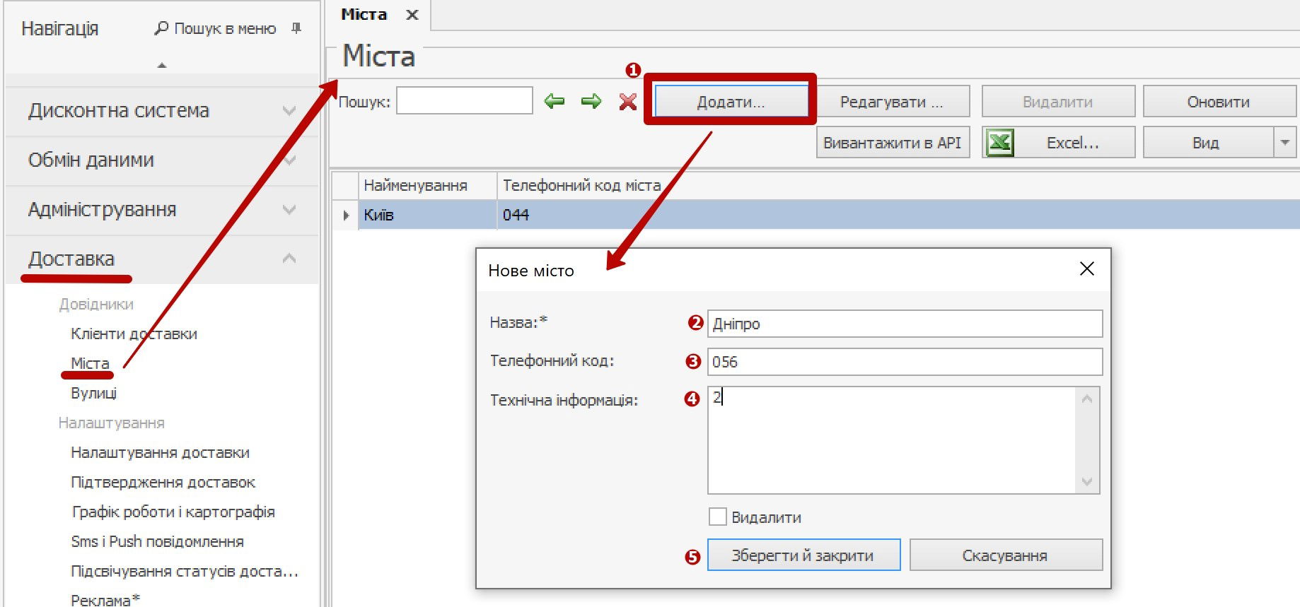 Додайте до довідника міста, у котрих здійснюється доставка. Для міста можуть бути задані один або кілька телефонних кодів. Якщо задано один код, він може автоматично додаватися при введенні короткого телефонного номера клієнта.