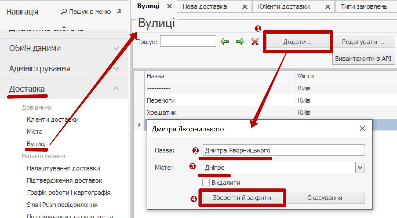 Якщо цей елемент більше не використовується, його можна видалити з довідника. Наприклад, цією вулицею доставка більше не здійснюється. Її можна видалити з довідника за допомогою кнопки Видалити.