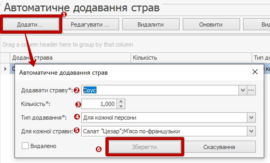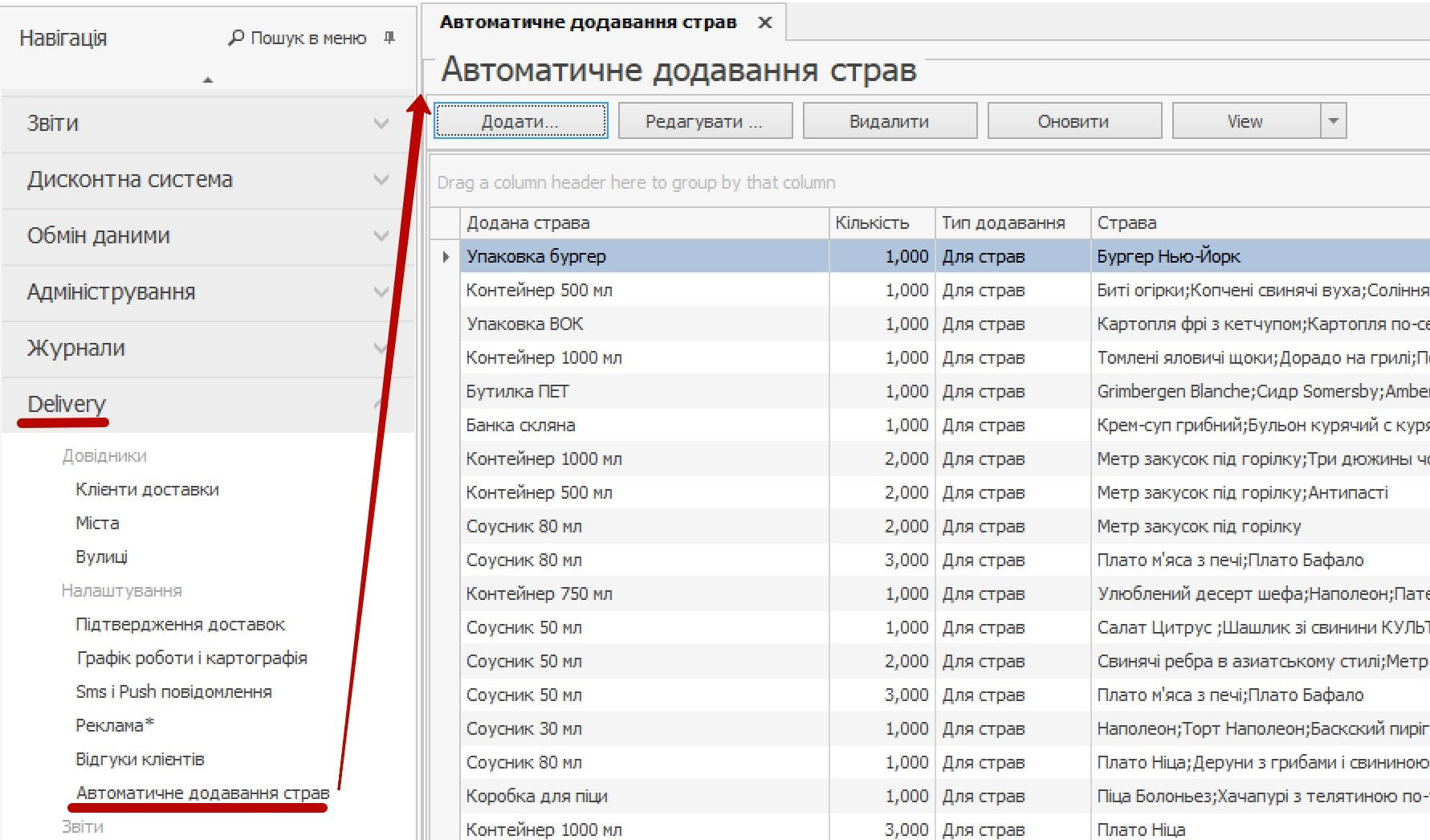 Відповідно до стандартів обслуговування клієнтів у замовлення можуть додаватися додаткові страви, наприклад столові прибори, безкоштовні соуси, імбир, васабі, а також платні послуги доставки. Такі додаткові страви автоматично додаються при збереженні замовлення до відділення. Можуть бути додані ті страви, які продаються у відділенні доставки, і в них вказано тип місця приготування. Щоб у замовлення автоматично додавалися додаткові страви: