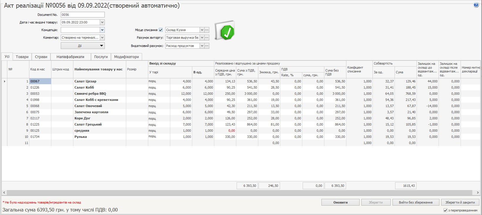 Документом Акт реалізації реєструються дані про продаж. На підставі даних про продаж протягом облікового дня, зареєстрованих через Syrve POS, формується автоматичний акт реалізації. Один документ формується для страв: