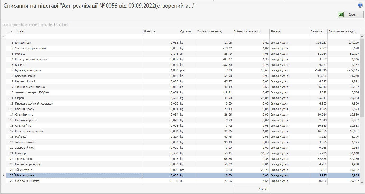 Акт реалізації, звіт про списання продуктів та про продаж страв та товарів можуть бути вивантажені у форматі MS Excel.