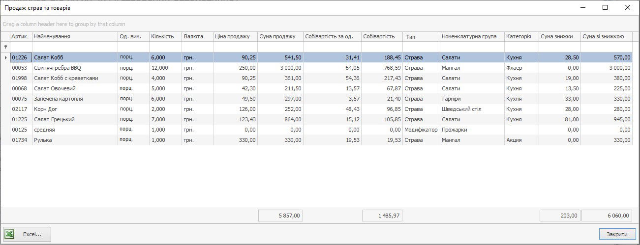 Щоб отримати зведену інформацію щодо реалізації страв: