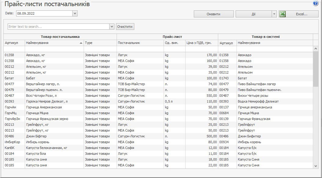 За допомогою звіту, наприклад, можна порівняти ціни на один і той же товар у різних постачальників. Для цього скористайтесь полем пошуку.