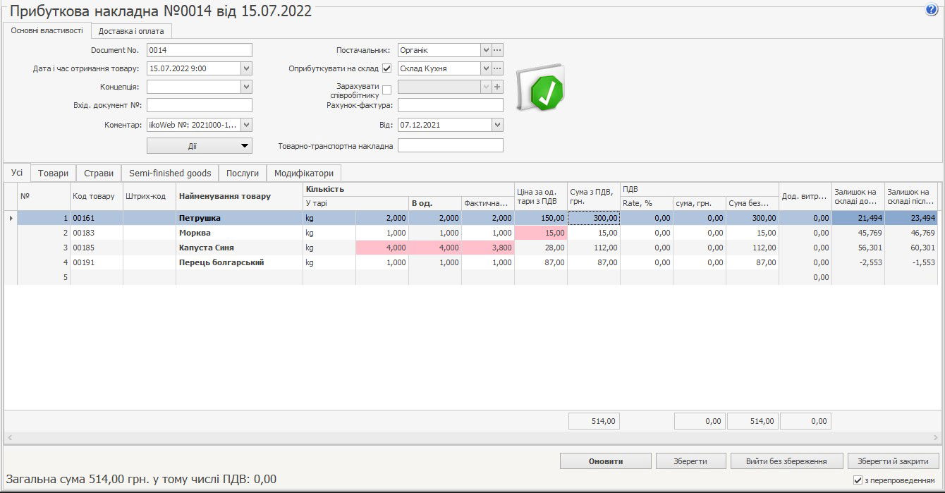 Після проведення документа до обліку буде прийнято кількість, вказану в колонці У тарі, але документ, у якому зафіксовано розбіжність, буде позначено значком у загальному списку документів. Надалі на різницю по кількості можуть бути зареєстровані акти списання або накладні на повернення.
