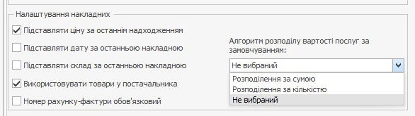 Щоб щоразу під час створення накладної не вибирати алгоритм розподілу, налаштуйте його за замовчуванням у закладці Налаштування обліку в налаштування торгового підприємства.