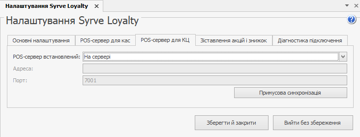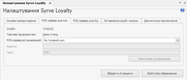 - За допомогою вкладки POS-сервер для кас, налаштуйте підключення Syrve POS терміналу (головної каси) до POS-сервера. Виберіть один з наступних варіантів у полі POS-сервер встановлений: