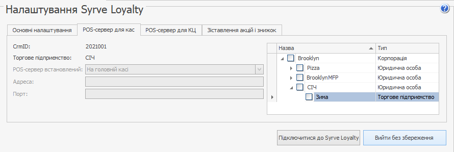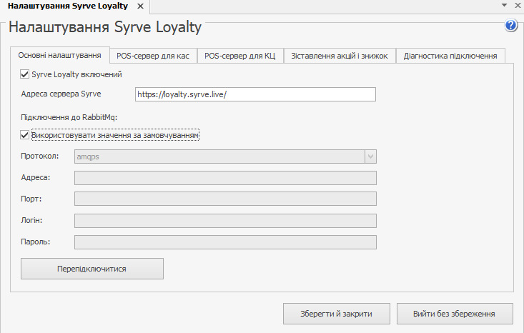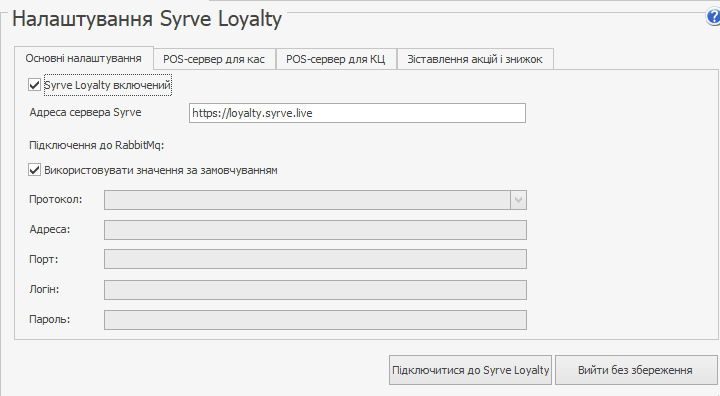 - Перевірте чи активовано значення Syrve Loyalty включений. Вам будуть доступні інші вкладки, які використовуються для налаштування параметрів підключення. Якщо галочка не встановлена, ви не зможете використовувати Syrve Loyalty.