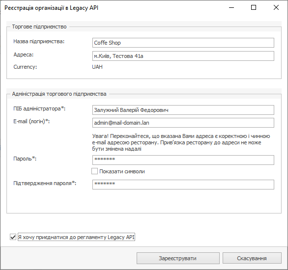 - Підтвердьте свою згоду приєднання до регламента Legacy API та натисніть кнопку Зареєструвати.