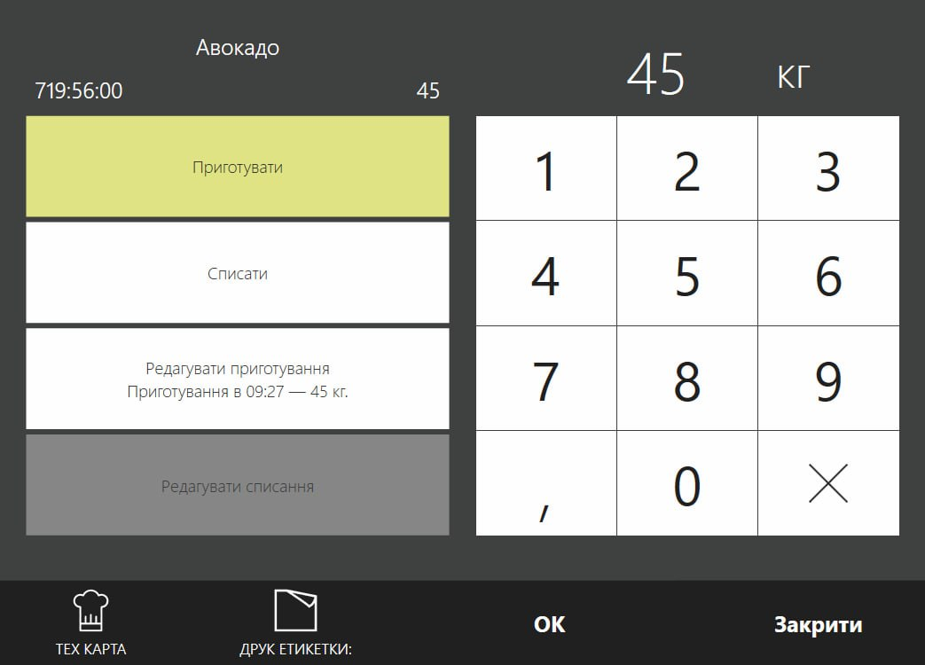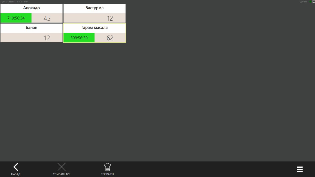 Ви можете списати всі непродані залишки страв одразу. Для цього на екрані контролю натисніть кнопку Списати всі страви та підтвердіть виконання дії. У результаті кількість усіх страв дорівнюватиме нулю.