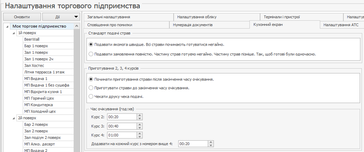 Ви можете встановити для курсів час затримки перед початком приготування (крім VIP та 1-го курсу, які починають готуватися відразу), а також вибирати режим приготування. Для цього перейдіть на вкладку Кухонний екран у розділі меню Адміністрування → Налаштування торгового підприємства.