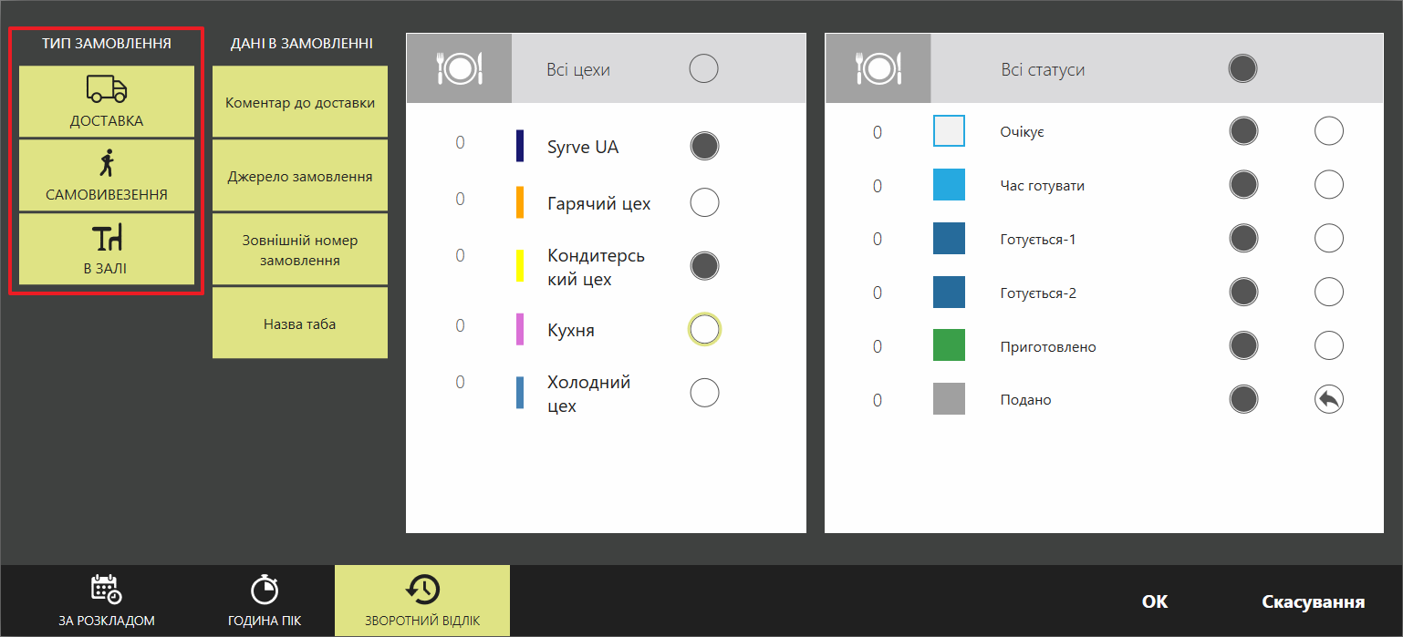 У KDS можна відфільтрувати замовлення за режимом обслуговування: "Зал", "Доставка" та "Самовивіз". Ця опція може бути корисною для працівників кухні, наприклад, пакувальників, оскільки вони можуть налаштувати екран таким чином, щоб на ньому не відображалися замовлення, які не потребують уваги.