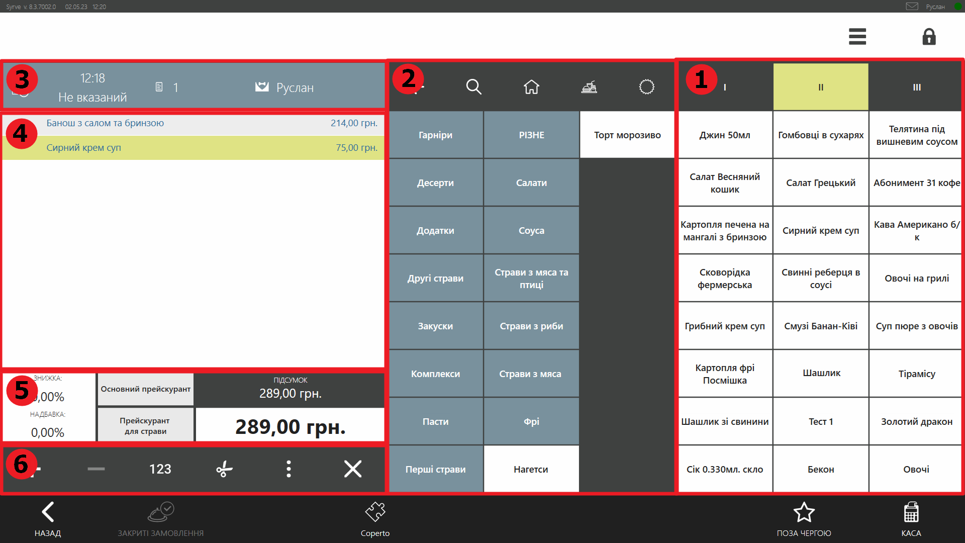 У лівій частині вікна обробки замовлення ви можете побачити список пунктів меню, які ви додали до замовлення. Посередині розташовані кнопки повних пунктів меню та груп пунктів. З правого боку ви можете знайти три вкладки з кнопками швидкого меню найбільш часто використовуваних елементів і груп. Швидке меню може бути налаштоване по дням тижня.