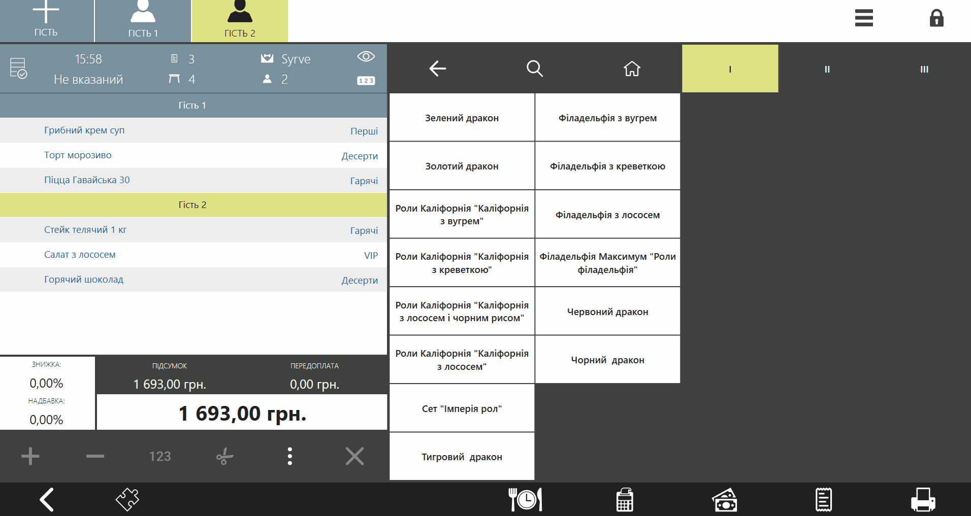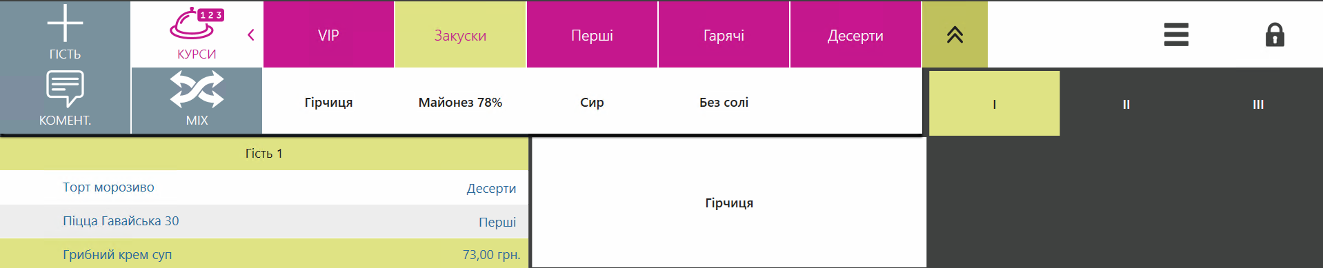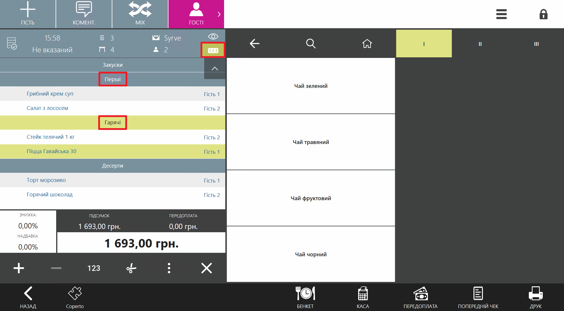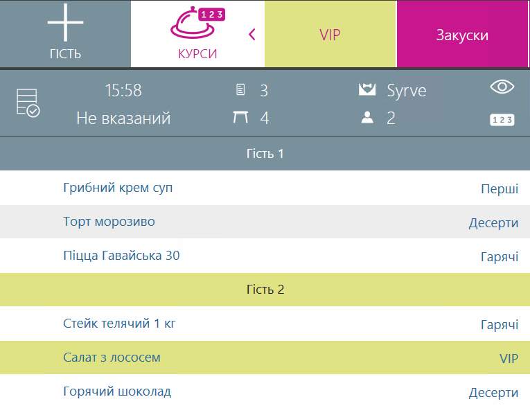 Щоб групувати страви не за гостями, а за курсами, до яких вони належать, використовуйте кнопку 123 у правому верхньому кутку списку страв. Це дає змогу визначити черговість подачі страв і подавати страви одного курсу одночасно та без затримок.