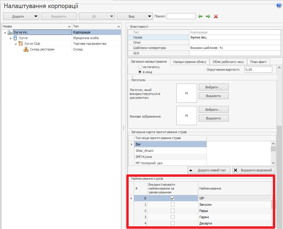 За замовчуванням в системі налаштовано п'ять курсів: VIP та курси з 1 по 4. Кількість курсів можна збільшити в налаштуваннях групи у полі Максимальний номер курсу. Якщо у страви курс вище, ніж в інших страв групи елементів, то автоматично страві призначається курс 1. Курс можна задати в картці страви. Докладніше у статті Додаткова інформація.