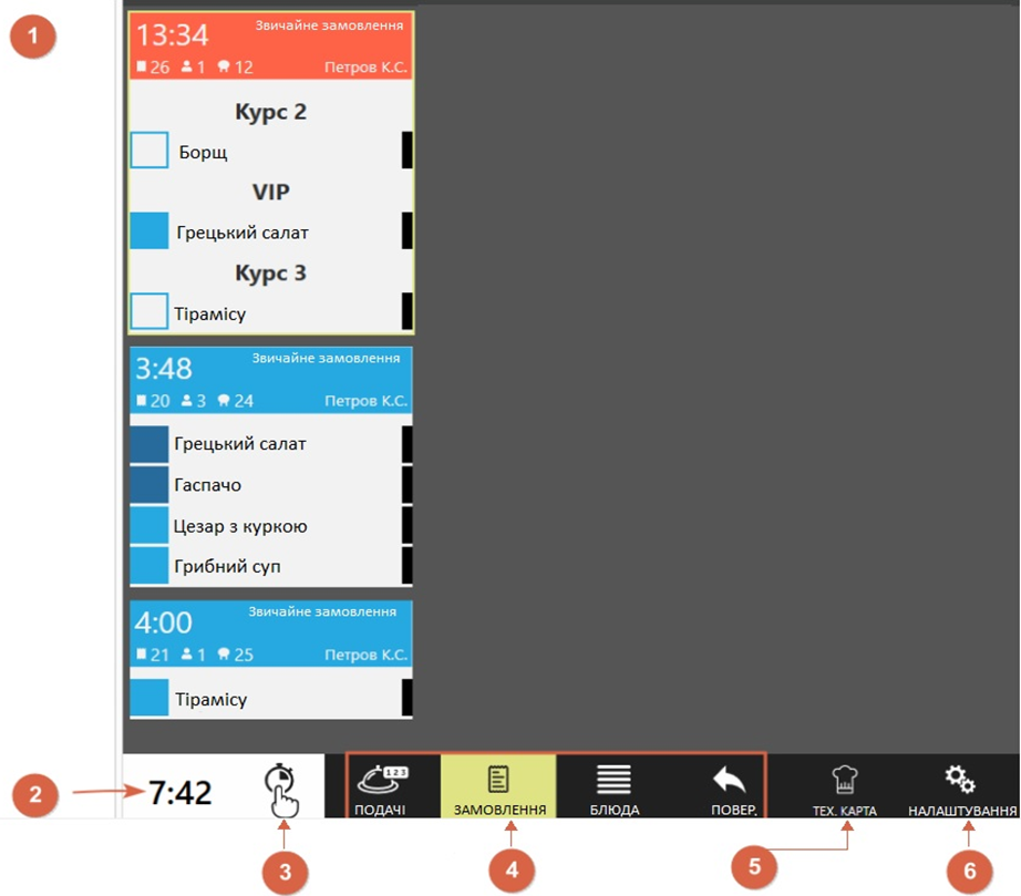 На екрані відображається кількість кожної страви, її назва та час, що залишився до подачі, номер столу та тип замовлення.