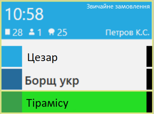 Статус блюда відображається на кухонному столі у вигляді кольорового прямокутника ліворуч від назви блюда. Статус замовлення відображається кольором шрифту замовлення.