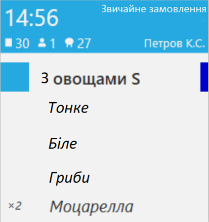 Модифікатор, який готується з основною стравою, показується разом із нею. Він має той самий статус та колір, що й основна страва. Цех та час приготування показуються лише для основної страви. Кількість модифікаторів відображається для кожної страви так само, як і на екрані замовлення.