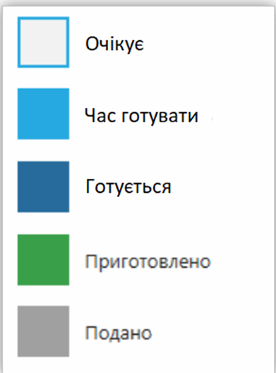 Назви статусів можуть відрізнятись від стандартних. Вони налаштовуються для кожного відділення окремо, див. Як налаштувати кухонний екран.
