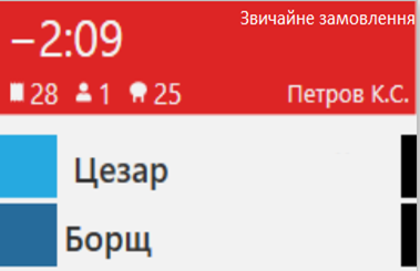 На екрані показано, скільки часу (у хвилинах) залишилося до видачі страв. Це стандартний час приготування. Він вимірюється як час між статусом «надруковано» та «просрочено». Якщо час закінчився, він стає від'ємним- включений зворотний відлік.