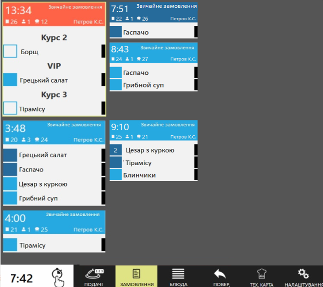 Страви згруповані за курсами, так їх зручно збирати на видачу до зали. Очевидно, які страви приготовлені, а які ще ні. Також видно коли всі страви готові та їх можна починати видавати.
