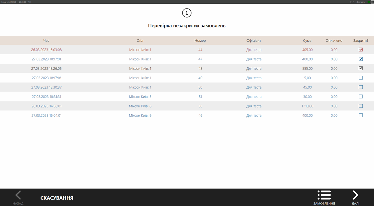 - Для примусового закриття встановіть навпроти замовлень галочки у стовпці Закрити? У цьому випадку вартість замовлення буде автоматично списана в кредит зі штрафом касиру, на який він зареєстрований. Для того, щоб перенести відкрите замовлення в наступну касову зміну, не встановлюйте галочку в полі Закрити?