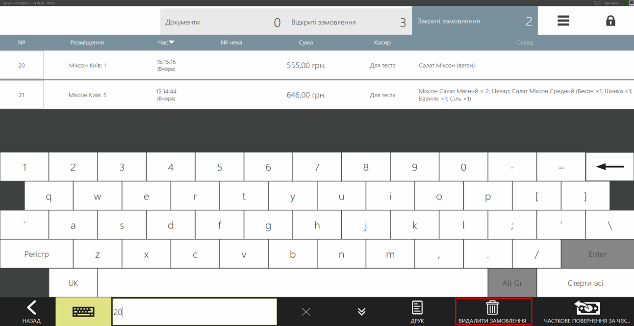 - Знайдіть у списку замовлення, яке потрібно повернути. Для швидкого пошуку натисніть кнопку віртуальної клавіатури та введіть ім'я працівника, який зареєстрував замовлення, або номер столу.